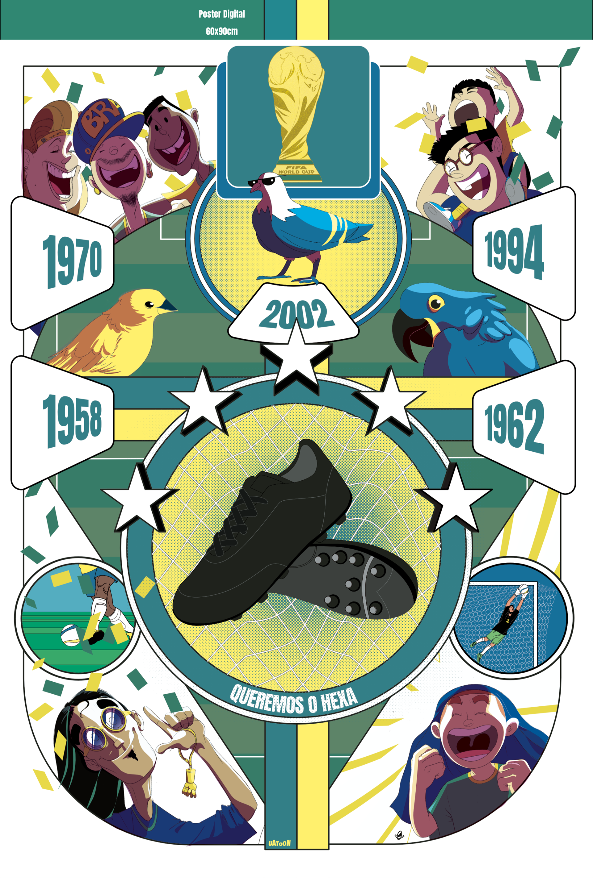 This was a personal project, a 90x60cm poster, made with the climate of our last cup in Qatar, cheering to bring our hexa, in highlights the dates of victory of Brazil, and in the center a boot similar to that of our late king Pelé.